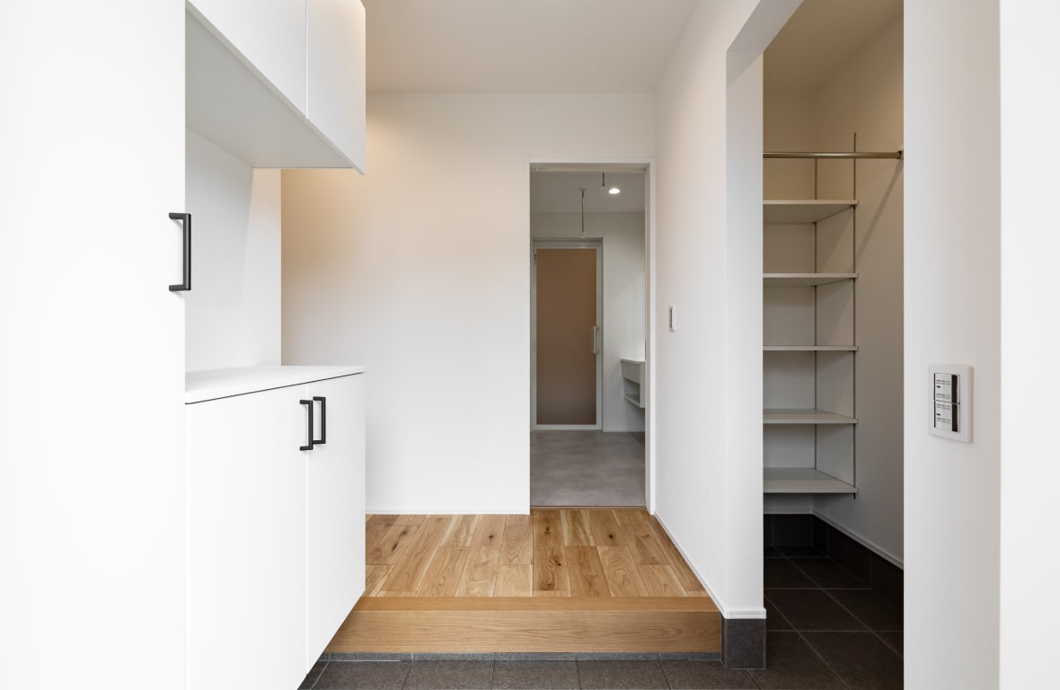 玄関周辺には収納スペースを多く配置しました。右側の土間スペースには靴類のほかにもベビーカーやゴルフバッグなどのアウトドアアイテムまで仕舞うことが可能です。