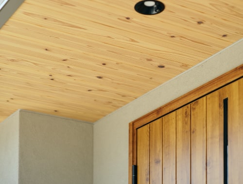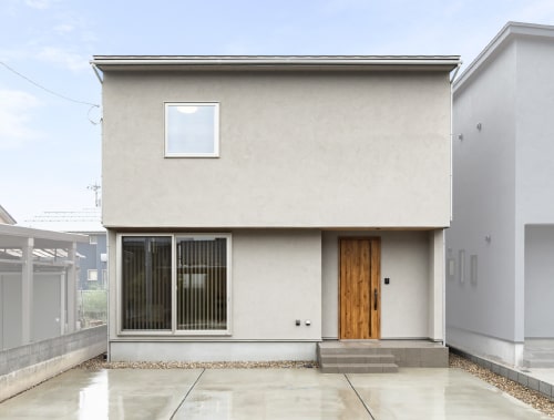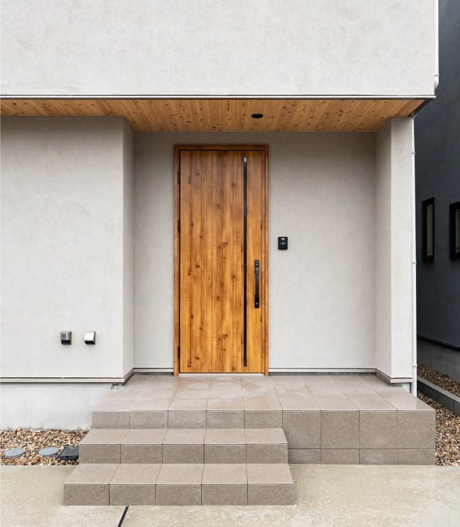 上質な塗り壁の落ち着いた質感に、天然杉板のアクセントが美しく調和し、住まい全体にあたたかな雰囲気を添えるナチュラルスタイルの外観。自然素材ならではの柔らかな風合いや経年変化を楽しむことができ、周囲の景観にもやさしく溶け込むデザインが魅力です。シンプルでありながらも存在感のある佇まいは、季節ごとに表情を変える光や影を受けて、より豊かで心地よい印象を与えてくれます。
