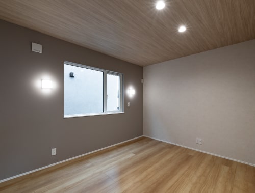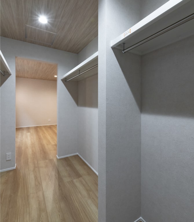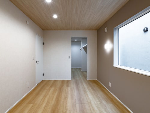 落ち着いた雰囲気の主寝室。天井には木目クロスを施し、上質で落ち着いた空間を演出しています。大型のウォークインクローゼットも完備しており、衣類のほかにも大型の荷物やシーズンオフのアイテムまで仕舞える余裕があります。