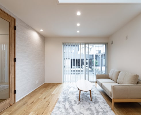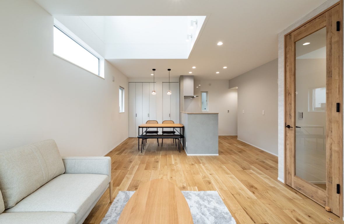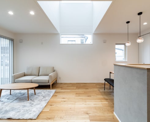 LDKには吹抜けを設け、東からの陽光をいっぱいに取り込むことで、北向きとは思えないほど明るく開放的な空間になっています。さらにダブル断熱 + 床暖房(1階全面)を採用することで、快適性も確保しました。