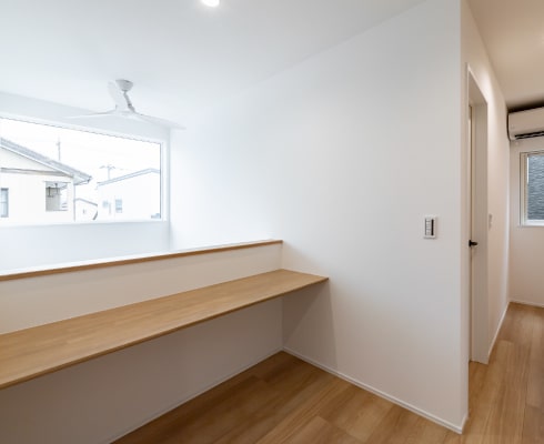2階ホールにはマルチに使えるカウンターを配置し、1階と吹抜けを介して程よい距離感でつながりながらも、作業に集中できる空間です。 -