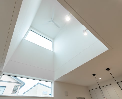 一部吹抜けで明るく開放感のあるLDK。白×木のやさしいナチュラルテイストの内装に、アクセントのグレーやペンダントライトが映えます。