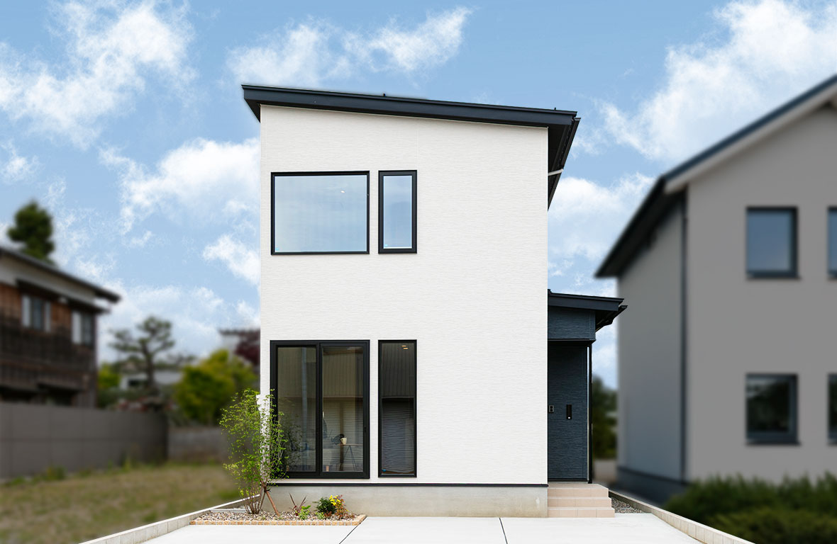 白を基調とした塗り壁調の外壁材ベースに、ブラックカラーのサッシが印象的なコントラストが美しい外観です。無駄を削ぎ落としたスクエアなフォルムで、すっきりとしながらも片流れ屋根で動きのあるシルエットに仕上げました。