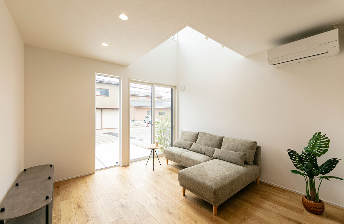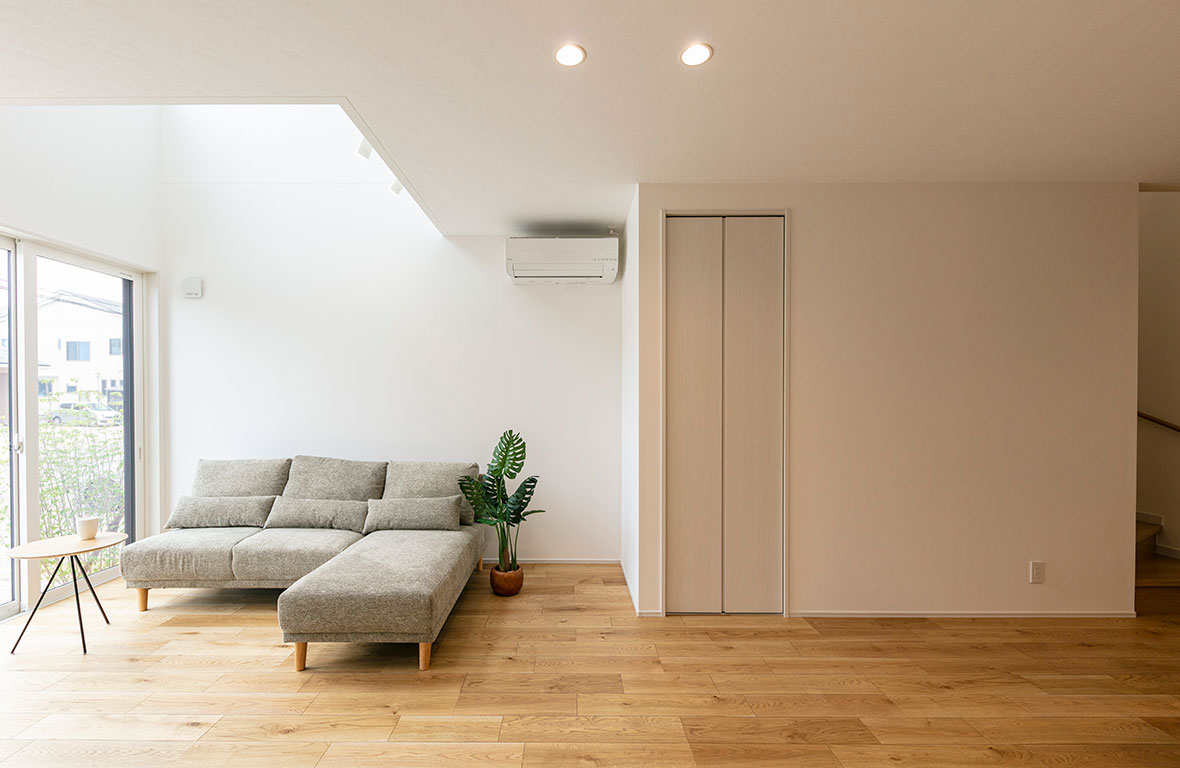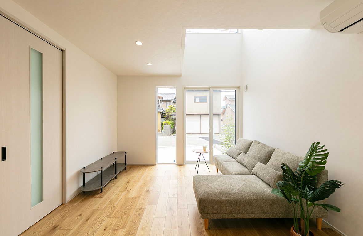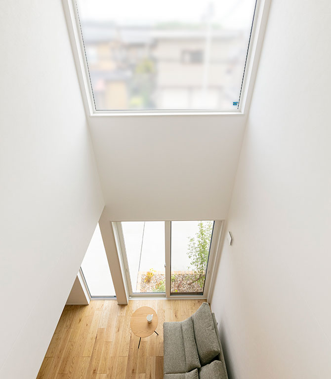 LDKに吹抜を設ける事で、間接光が安定的に採りこめ明るく開放的な空間になります。帖数以上の広がりを感じます。