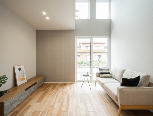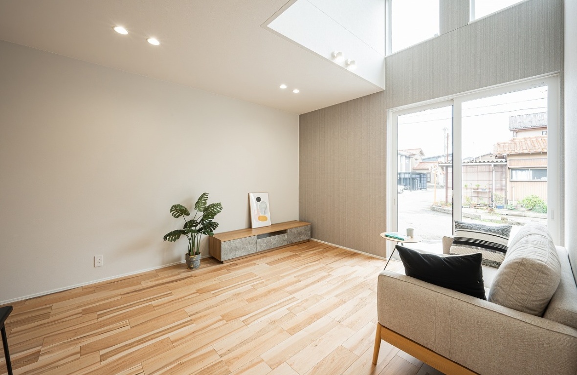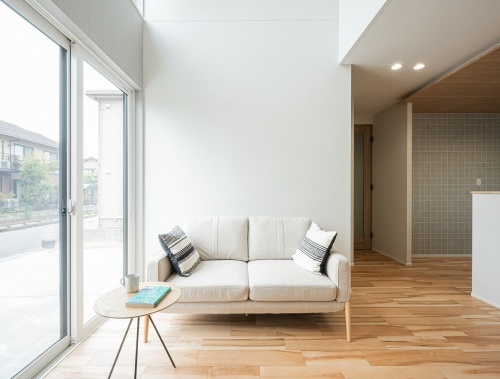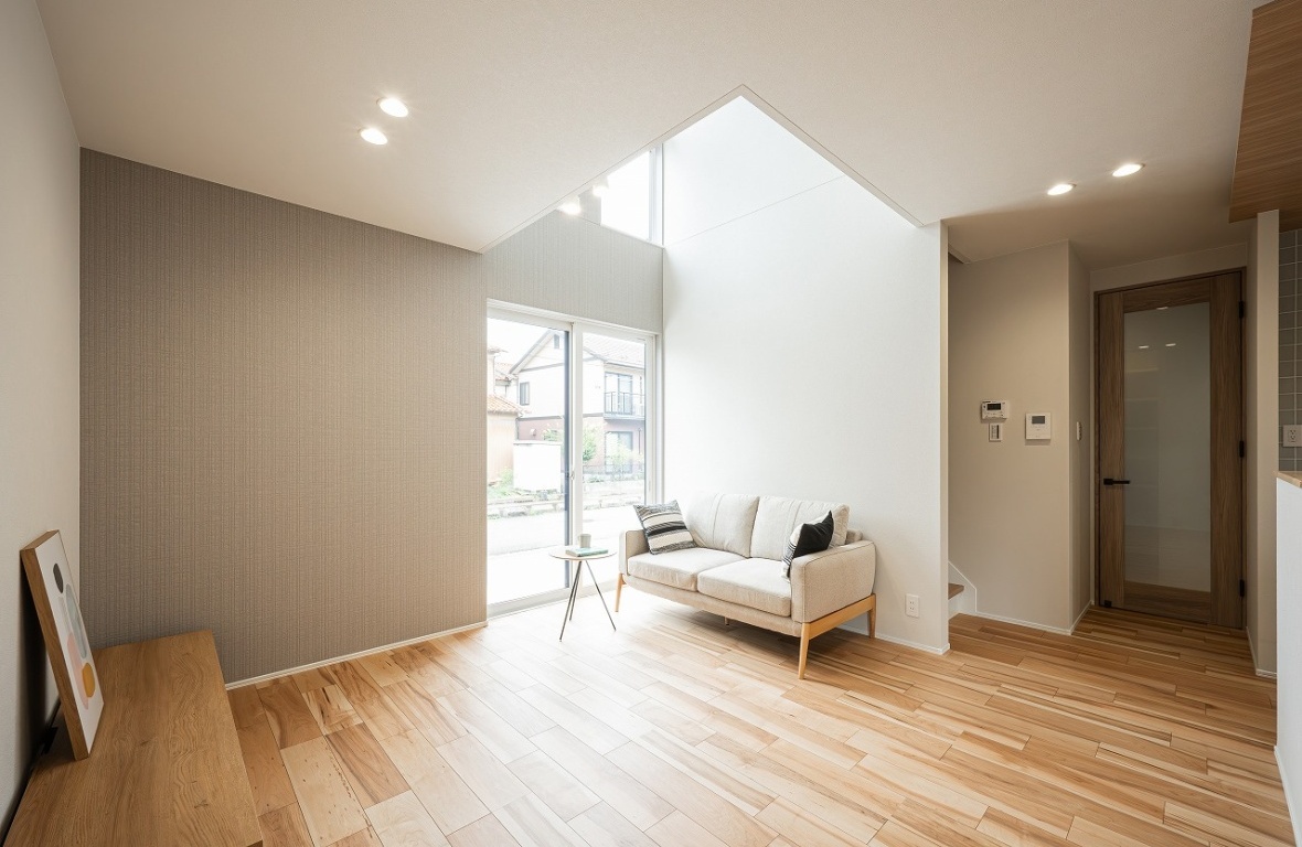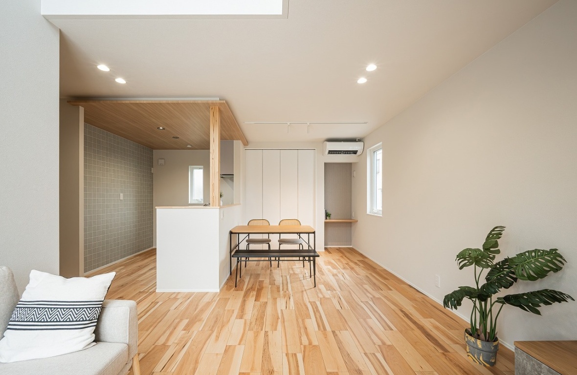 LDKに吹抜を設ける事で、間接光が安定的に採りこめ明るく開放的な空間になります。帖数以上の広がりを感じます。南から差し込む光の筋と草木の影が映し出される壁は、日々の暮らしに自然の気配を感じさせてくれます。