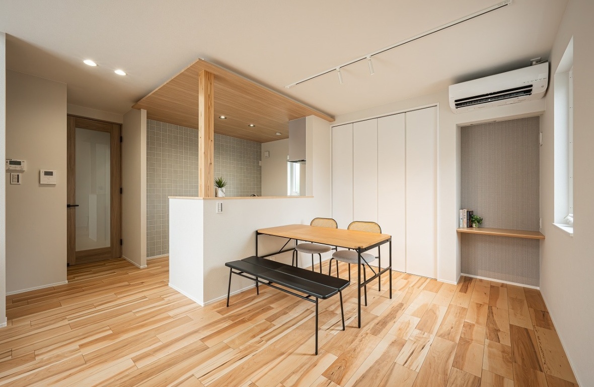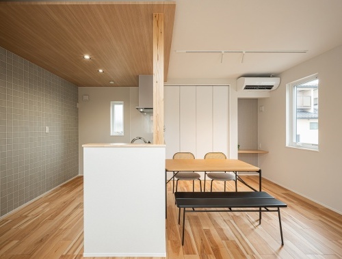 キッチンの天井を一段折り下げて木目調にすることで、木目の質感がもたらす温かみを感じさせてくれます。木のぬくもりに、タイルの繊細な色合いを重ねることで、空間全体に品のある調和が生まれ、日々の暮らしに静かな上質感を添えています。